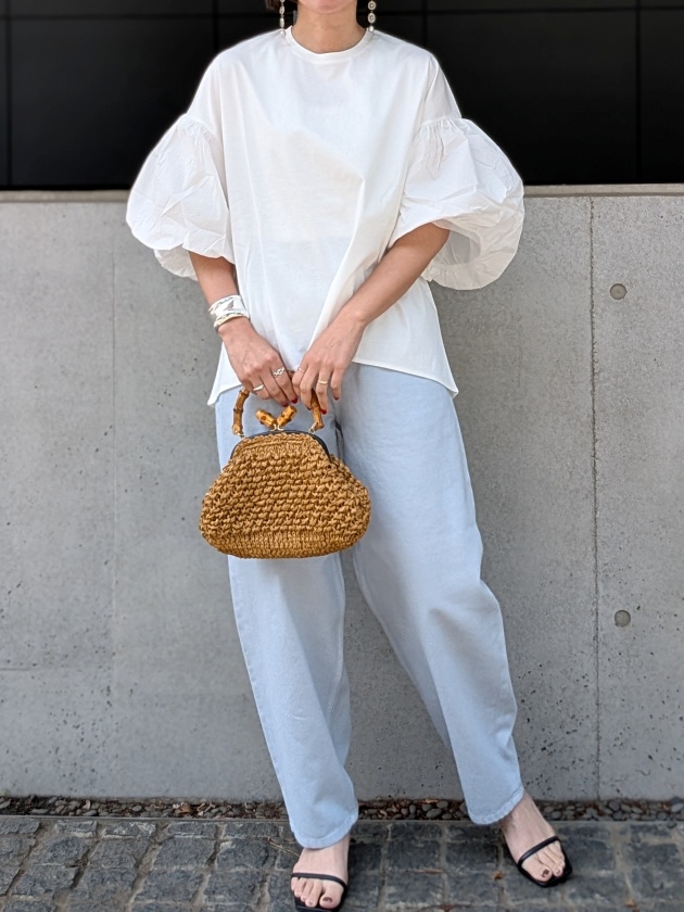 シンプルなトップスを合わせるだけでも今っぽいバランスに仕上がります。