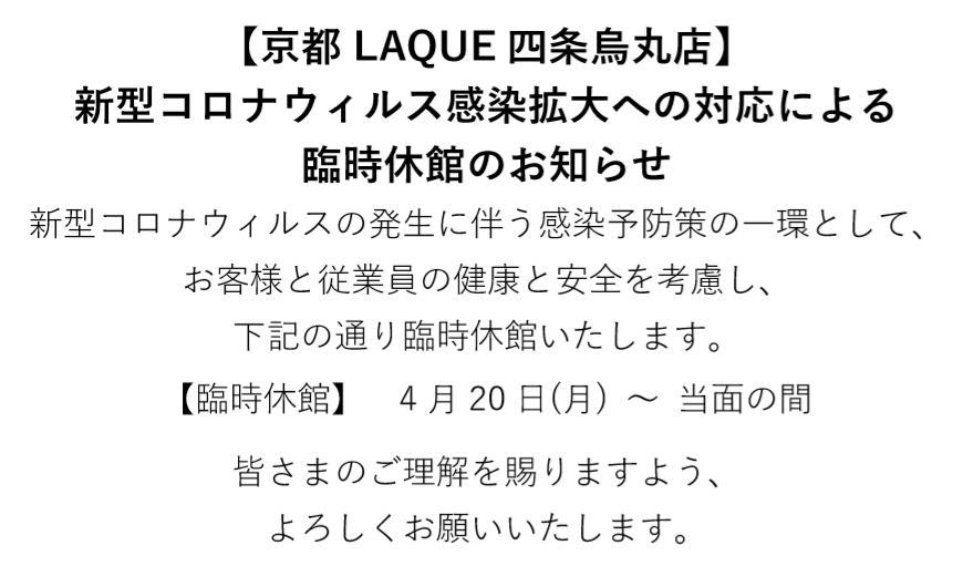 【京都LAQUE四条烏丸店】臨時休館のお知らせ