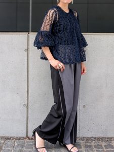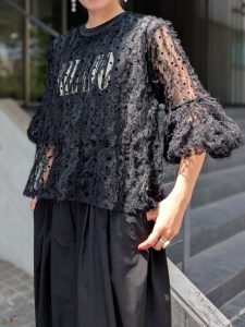 TORAZZO DONNAの新作、フロッキードットをあしらったチュール素材に、立体的なフリルを贅沢に施した華やかなブラウス。きれい目パンツかスカートにもぴったりですし、デニムにもばっちり◎