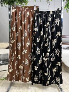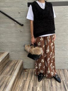 一番人気は、こちらの主役級のパンツ!秋らしい配色のフラワープリントが目を引くワイドパンツ。
