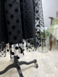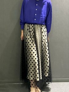 今回初のWEB限定アイテムですが、Top3はこちらのスカート。チュールレースにフロッキープリントされたドットが、フェミニンとたまらないデザインが人気。また、季節を問わない素材なので冬はニット、夏はTシャツなど一年中楽しめるのも嬉しいですね!