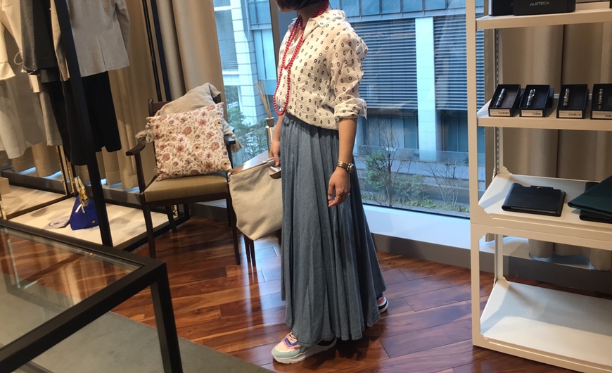 柄が面白い長袖シャツには毎年人気のMONILEロングスカートの新しく入ったダンガリーを合わせました。