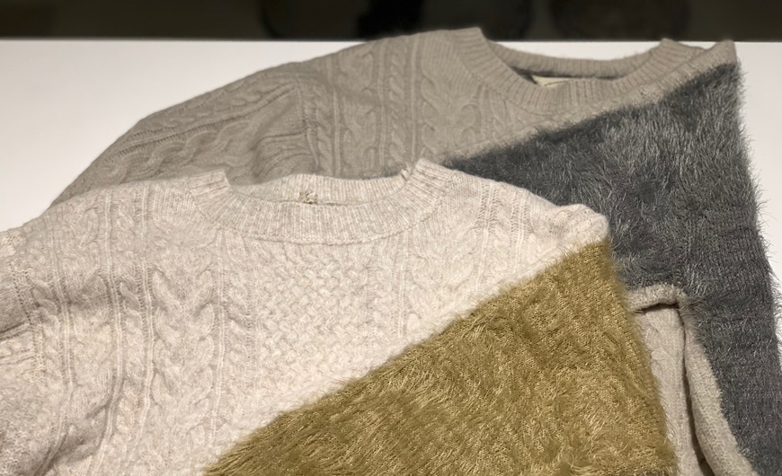 トップスはシャギーの切り替えが楽しめるニットをチョイス。