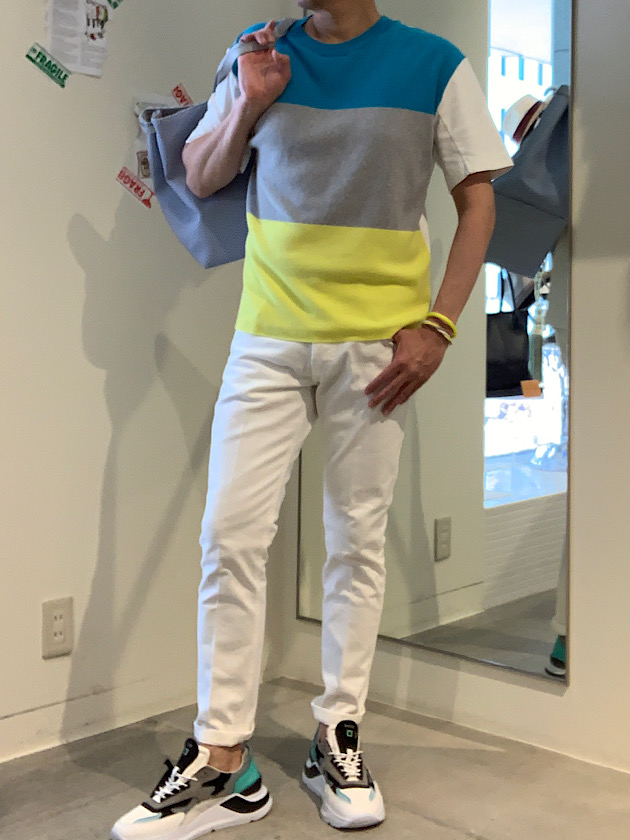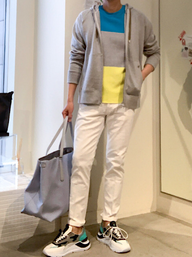 こちらのroberto collinaのニットは見頃のブルーとイエローのネオンカラーにグレーをプラスする事で遊びが効いた配色になっています。