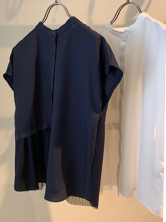 切り替え部分にレースを施し、アクセントを効かせたこちらのブラウス。