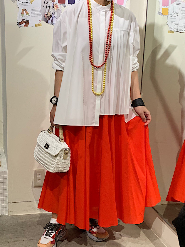 発色がキレイなロングスカートのコーディネートで、華やかな雰囲気が楽しめます!