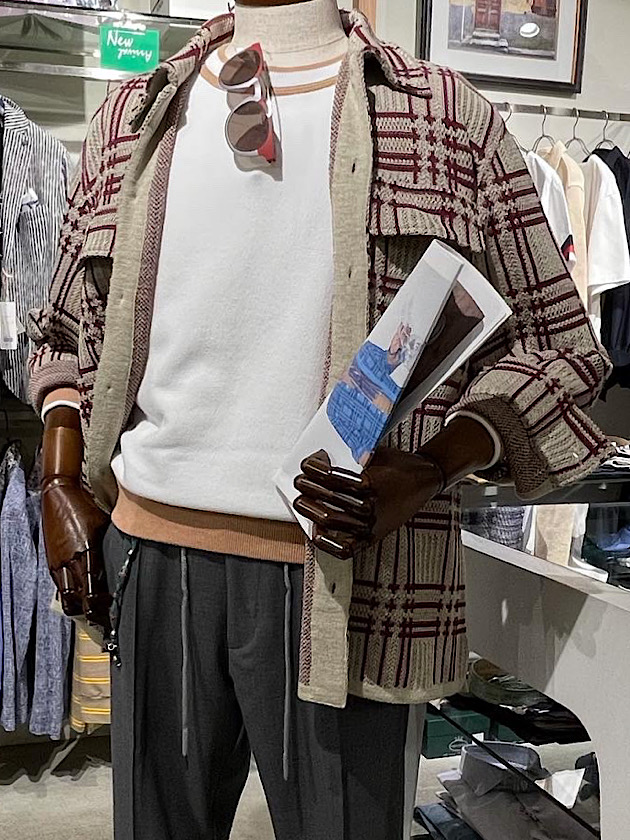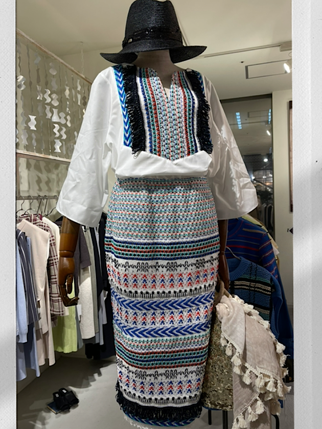 ボヘミアン調の色鮮やかなツウィードニットが印象的なセットアップは、気分がアガります!