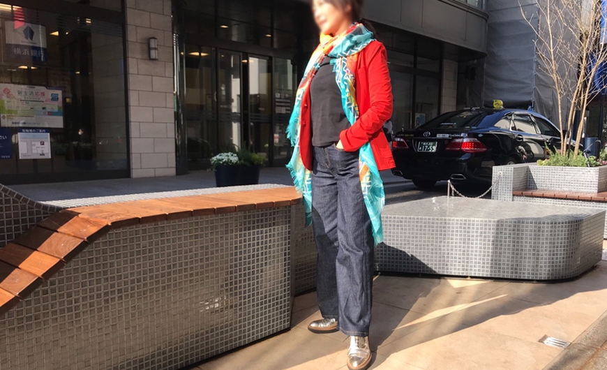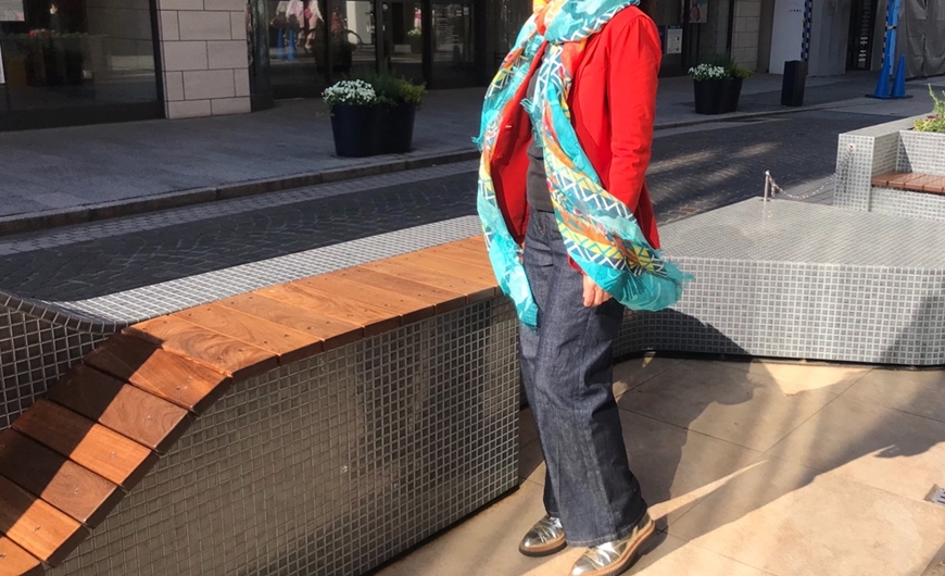 CIRCOLのオレンジのジャケットにNotifyのノンウォッシュデニムにalteaのカラフルなストールでアクセント。