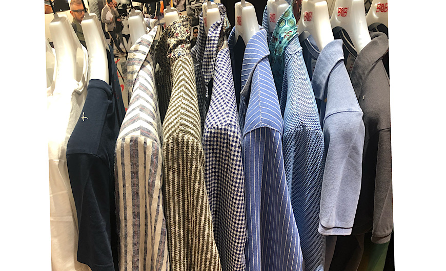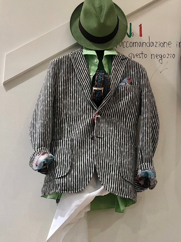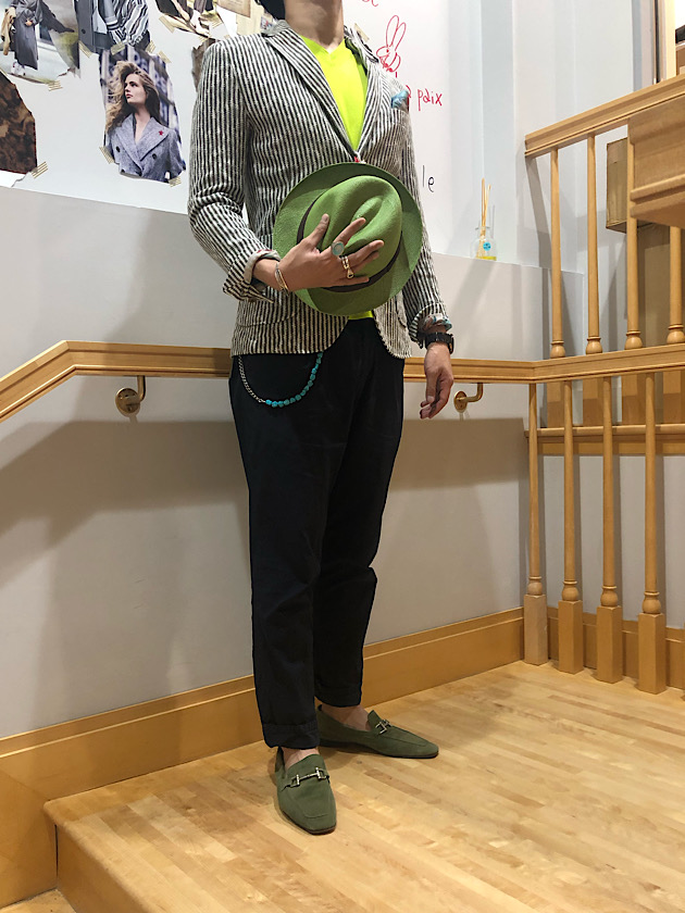 明るめのカットソーや、グリーンのシャツでまとめて。