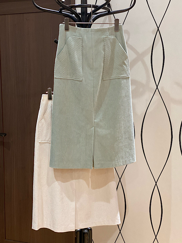 スカートは大きめなフロントポケットがカワイイコーデュロイのタイトスカート。
