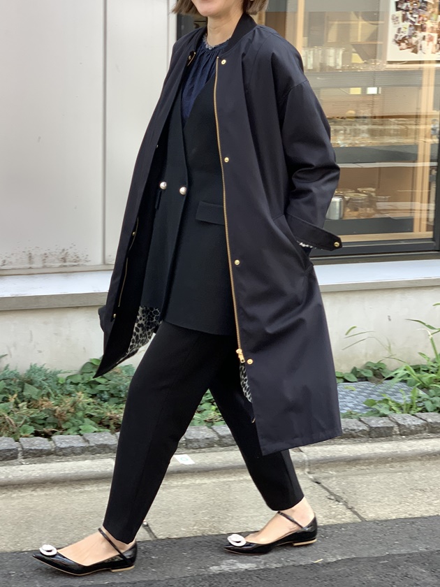 トレンチコートのような感覚で着られます。前を全部閉じてもサイドスリットで歩幅を確保できるのは