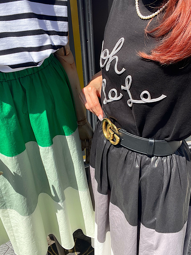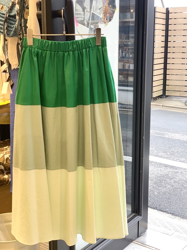 3カラーブロックスカートは、ツヤ感のある素材で特に晴れた日はキラキラして綺麗✨これなら、お食事など少しお洒落したい日にもばっちりですね😊