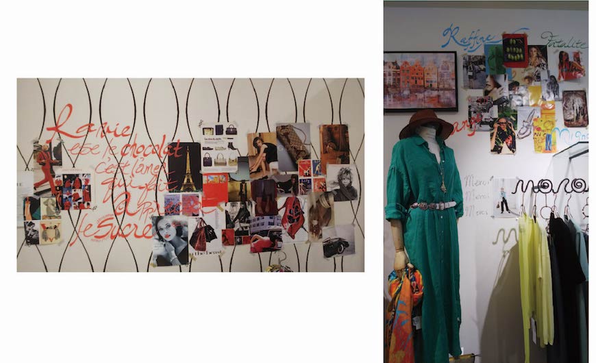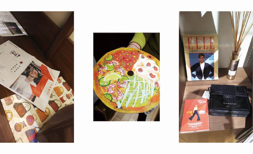 バイヤーがParisに行った時の展示会のパンフレットや、スタッフの手造りPIZZAのオブジェなどを演出に使っています。