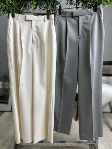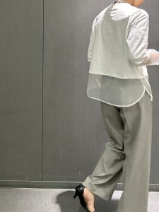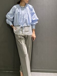 春らしいクリーンなお色味のハリと落ち感のある素材を使用したタックパンツです。同素材のノースリーブとセットアップにもなります✨単品でもきれい目にブラウスやシャツで、もしくはスエット&スニーカーでカジュアルに、オンオフ問わず出番が多いアイテムです★