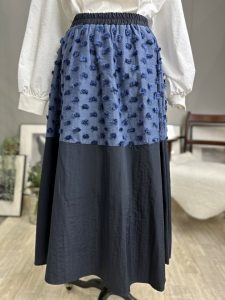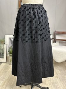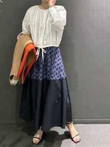 バイカラーアイテムがトレンドのシーズンですが、こちらは立体的なドットと同色の生地を切り替えた新感覚のスカートです。表生地の無地部分と同じナイロン素材を裏地に採用したしっかりとしたお作りとなります。オケージョンとしてもカジュアルでもOKな見映えする主役スカートです。
