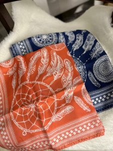 こちらのスカーフは、首に巻いてコーディネートのアクセントカラーとしてお使いいただいたり、もしくはお手持ちのバッグに飾りとしてのご使用も素敵です!