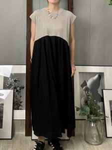 一枚で着られるワンピースは暑い夏には特に人気です★程よいノースリーブなので肩のラインも隠れて安心して着られるのも嬉しいポイントです!ニット部分は、薄手のサマーニットで、スカート部分は張り感のあるスポーティな生地のドッキングデザインです。
