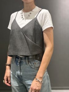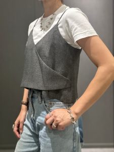 いつものコーディネートにプラスするだけで旬のスタイリングが完成する、アクセサリー的なアイテムですね♪ 今回はデニムでスタイリングしましたが、ブラックパンツや、タイトスカート、もしくはワンピースに合わせても素敵ですね!このようなアイテムはレースが多いですが、きれい目な生地を使っていますので、甘くらなずに着こなしていただけます。