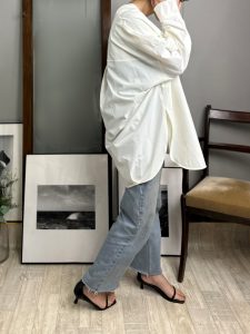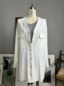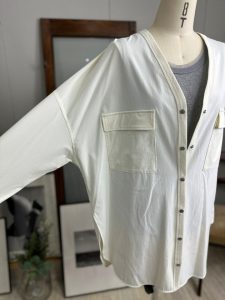 最後におすすめのVネックポケットシャツです。前開きなのでアウター感覚で使っていただいてもOKですし、サイドスリットが深く入っていますのでインしてブラウスとしても素敵です✨