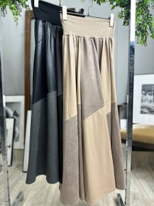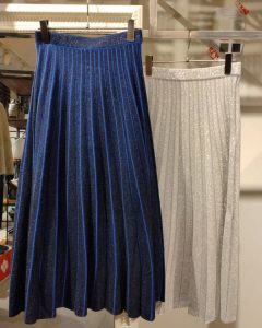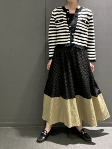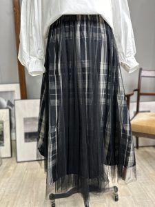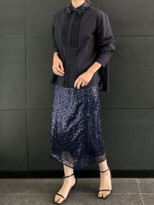 光沢のあるラメや透け感のあるシアー素材を組み合わせたスカートや、リバーシブルで両面楽しめるスカートなどデザイン豊富なものが増えています★トップスはシンプルに、スカートを主役にコーディネートしていただくとグッと新鮮に気分もウキウキします。
