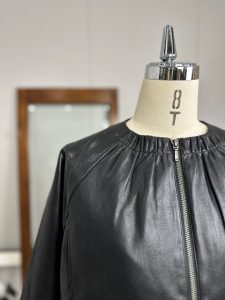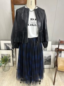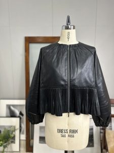 まるでリアルレザーのような質感が素敵なエコレザーのブルゾン。裾のプリーツの縫製がとても綺麗です。レザーブルゾンでここまでの細かいディティールは唯一無二ですね♪こちらも「お早めに」の予感です。