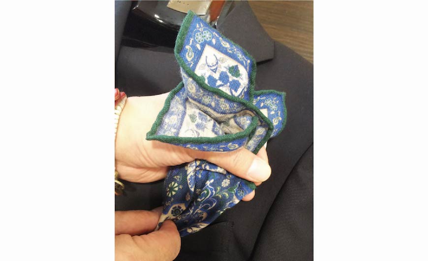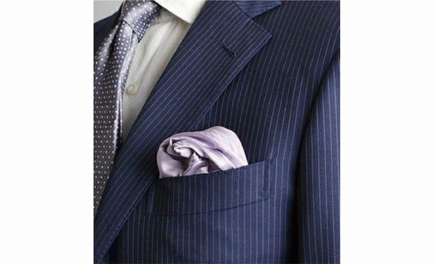 いずれにしても、きちんとした作りのスーツやジャケットに、あえて少し崩したポケットチーフの入れ方をクラッシュドスタイルですることで少し遊びや抜け感が出ると思うので、最近はこちらをおすすめしています。