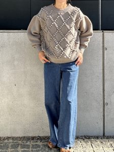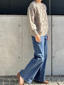 冬の定番、ケーブル編みニット。こちらは、アウターなどを羽織っていると一見ベーシックなケーブル編みニットに見えますが、アーム部分にノルディック柄が編み込まれていて手の込んだデザインが特徴です。