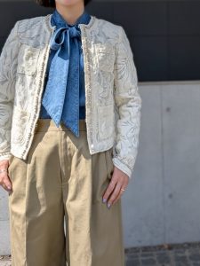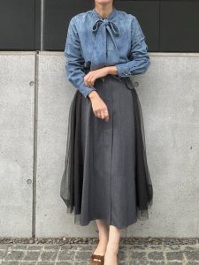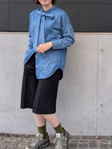カジュアルな印象が強いデニムブラウスですが、とろみのあるデニム生地の質感とカジュアルなデニムでありながらエレガントな印象のボウタイ仕様で、洗練された着こなしを叶えてくれるブラウス。