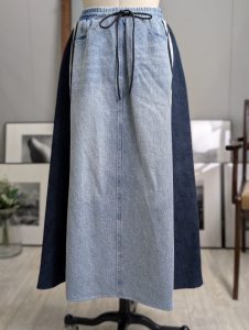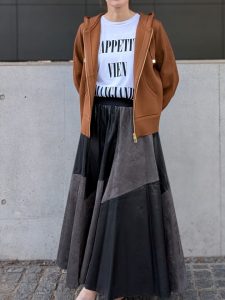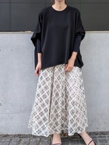 毎回様々な生地を使い、デザインも豊富なモニーレのスカートは大人気です。身長や体型を選ばず、ウエストは締め付けの出にくいリブでフリーサイズとなります。