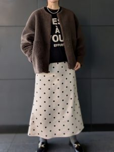 ブラウンのボアブルゾンで季節感を出しつつ、ドット柄スカートで可愛らしさをひとさじ。
