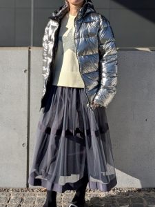 光の反射が美しいシルバーダウンは、クリスマスの夜に映える主役級アウター。