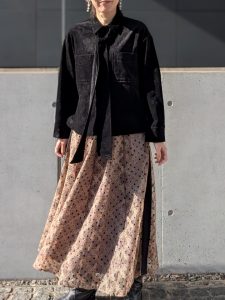 LOOK 04|ベロアリボンシャツ × エンブロイダリースカート
