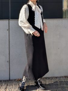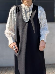 シンプルな黒ワンピースも、ベロア素材のブラウスをINするだけでホリデー感がUP。