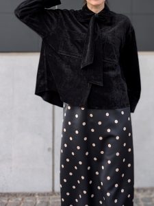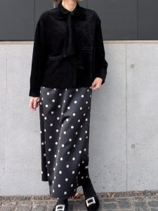 LOOK 07|ベロアリボンシャツ × ドットスカート