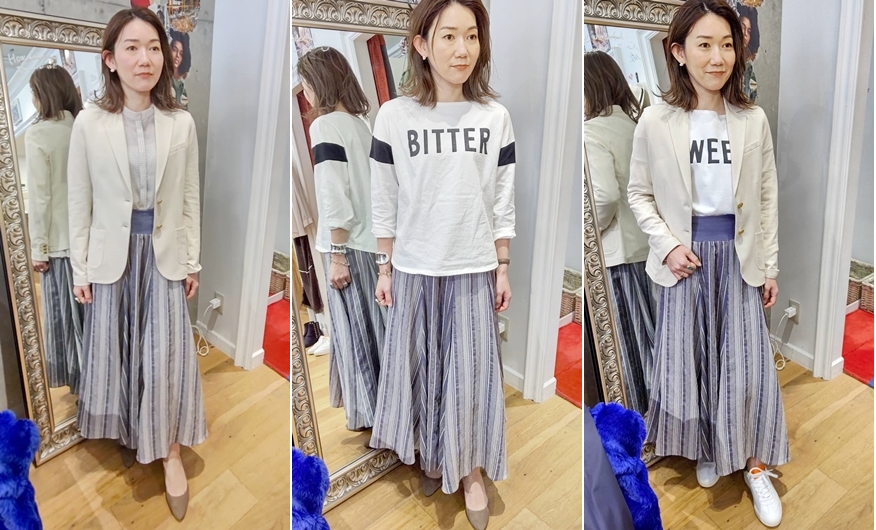 このデニムスタイルとスカートスタイルの2つの画像を比べると、力まないこなれた感じになっています。