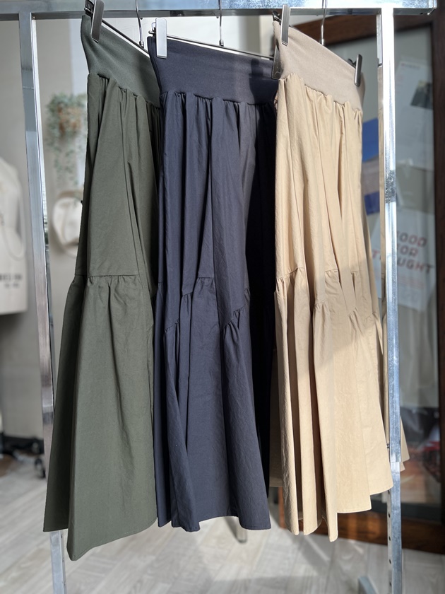 新たにブラックも追加した程の人気のギャザースカート♥ウエストがリブになったタイプのスカートはMANOではすっかり定番でリピーターさんの多いスカートです♪着丈が長い場合は、カットしてお直しも可能ですが、ウエストを半分追って頂ければ十分です。また、季節感のないコットン100%のお素材も人気の理由です★何にでも合わせやすいブラックが特に人気です。