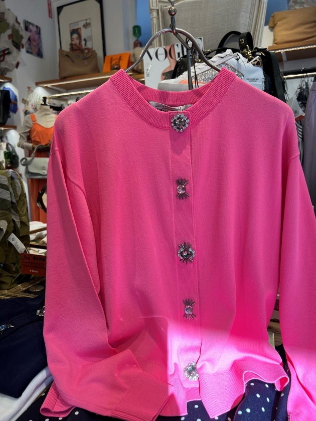 毎シーズン色足しする方も多い、ビジューカーデ♥ボタンのデザインは毎年リニューアルしていて、今年は大きさの異なるビジューをびっしり敷き詰めたアンティーク感のあるデザインに✨発色も良く、ポイントに。また、小さく畳んでもシワになりにくいので、ご旅行などにサッと持ち運びが出来て、肩掛けも便利です。